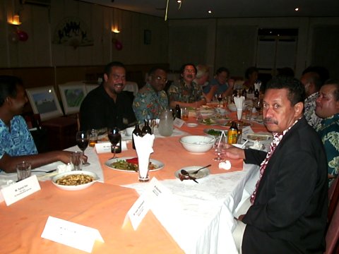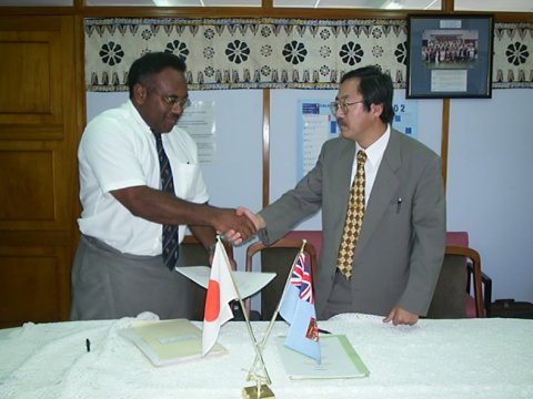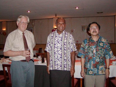 コンサルタント契約後のパーティに出席された保健大臣(中央)とフランクWHOフィジー駐在員(左)。